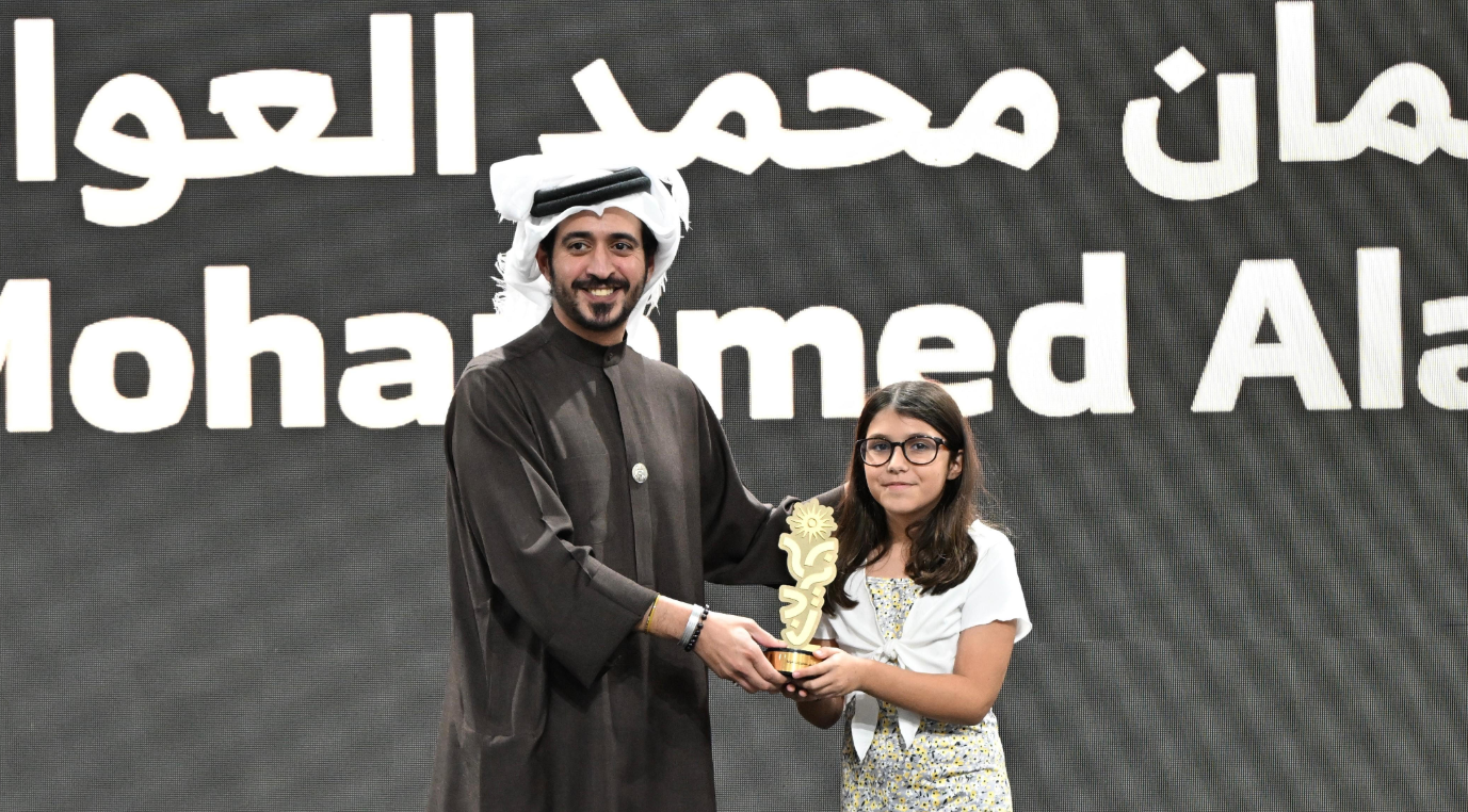 His Highness Shaikh Khalid bin Hamad Al Khalifa presenting Leana with her award